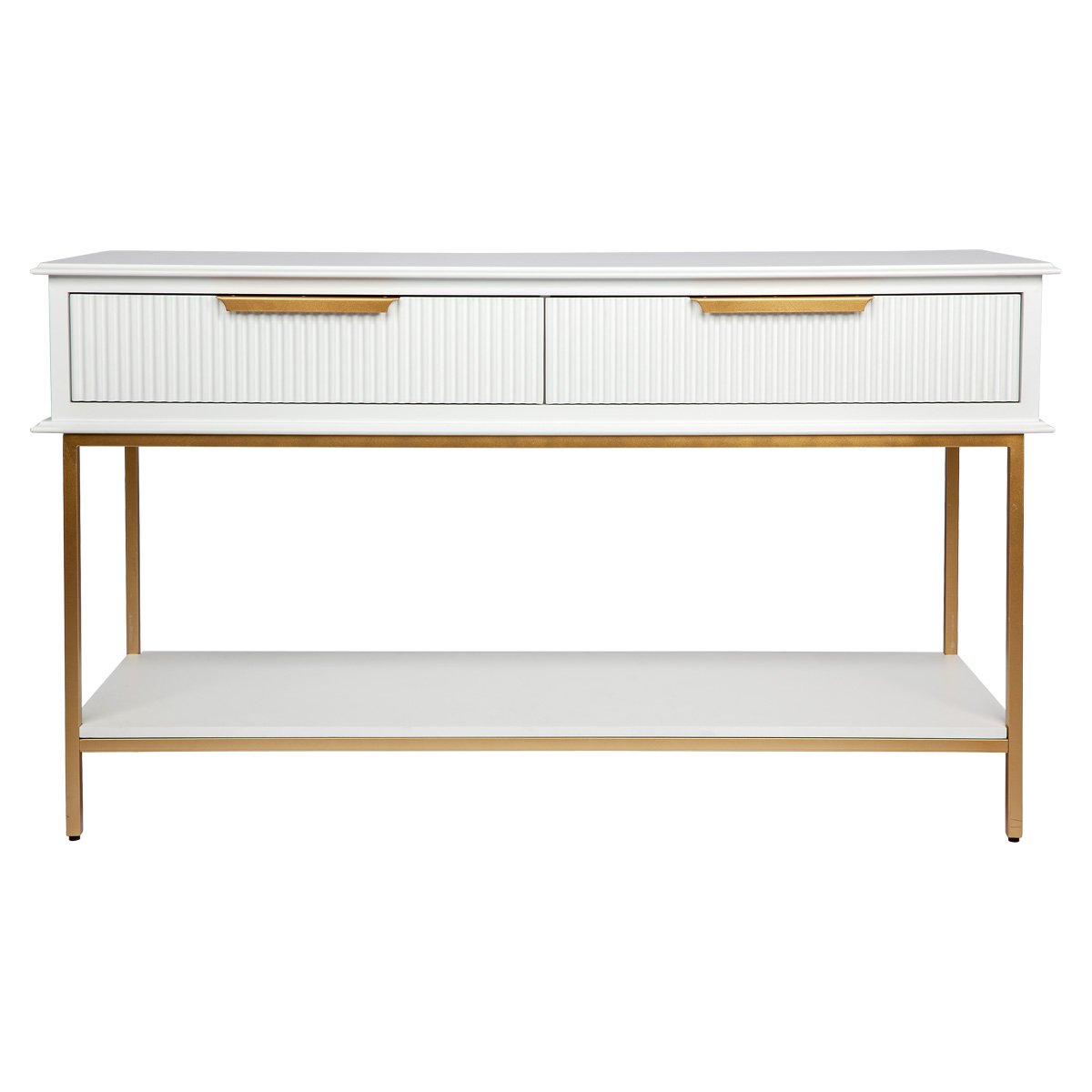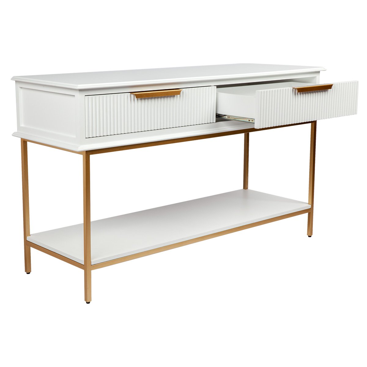 Classic contemporary in design, the small Aimee console table features fluted drawer fronts and an elegant streamline profile in a satin white painted finish with contemporary gold metal hardware and iron frame. Also available in a 2m length, three drawer option, the Aimee range has been designed to slip seamlessly into both classic and modern interiors offering practical and stylish solutions for entry, hallway or living room spaces.