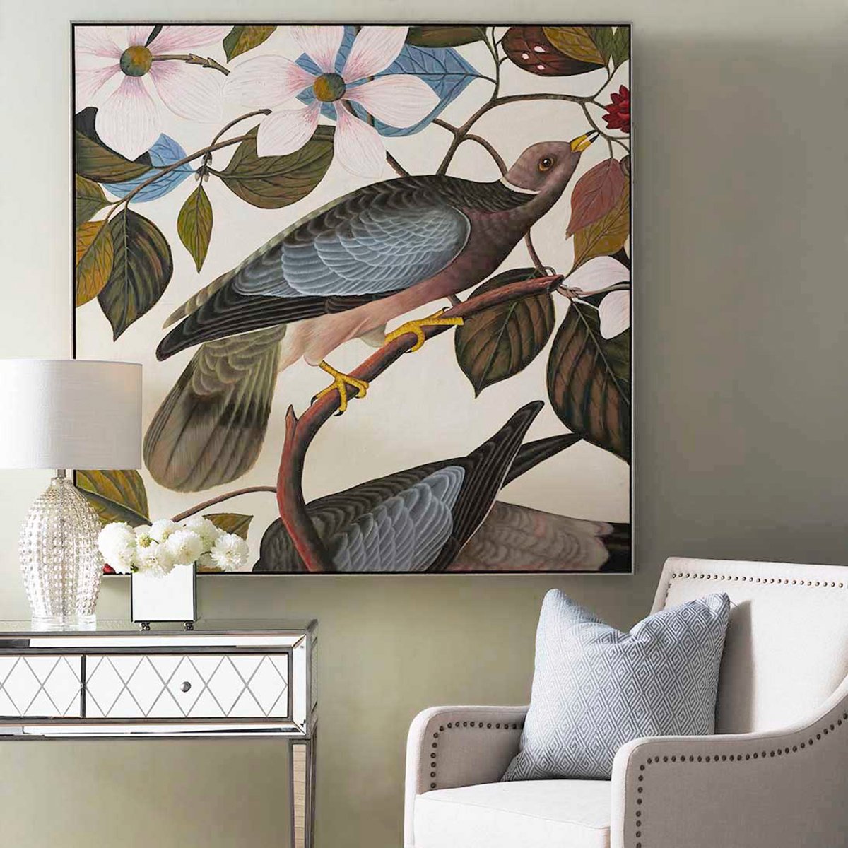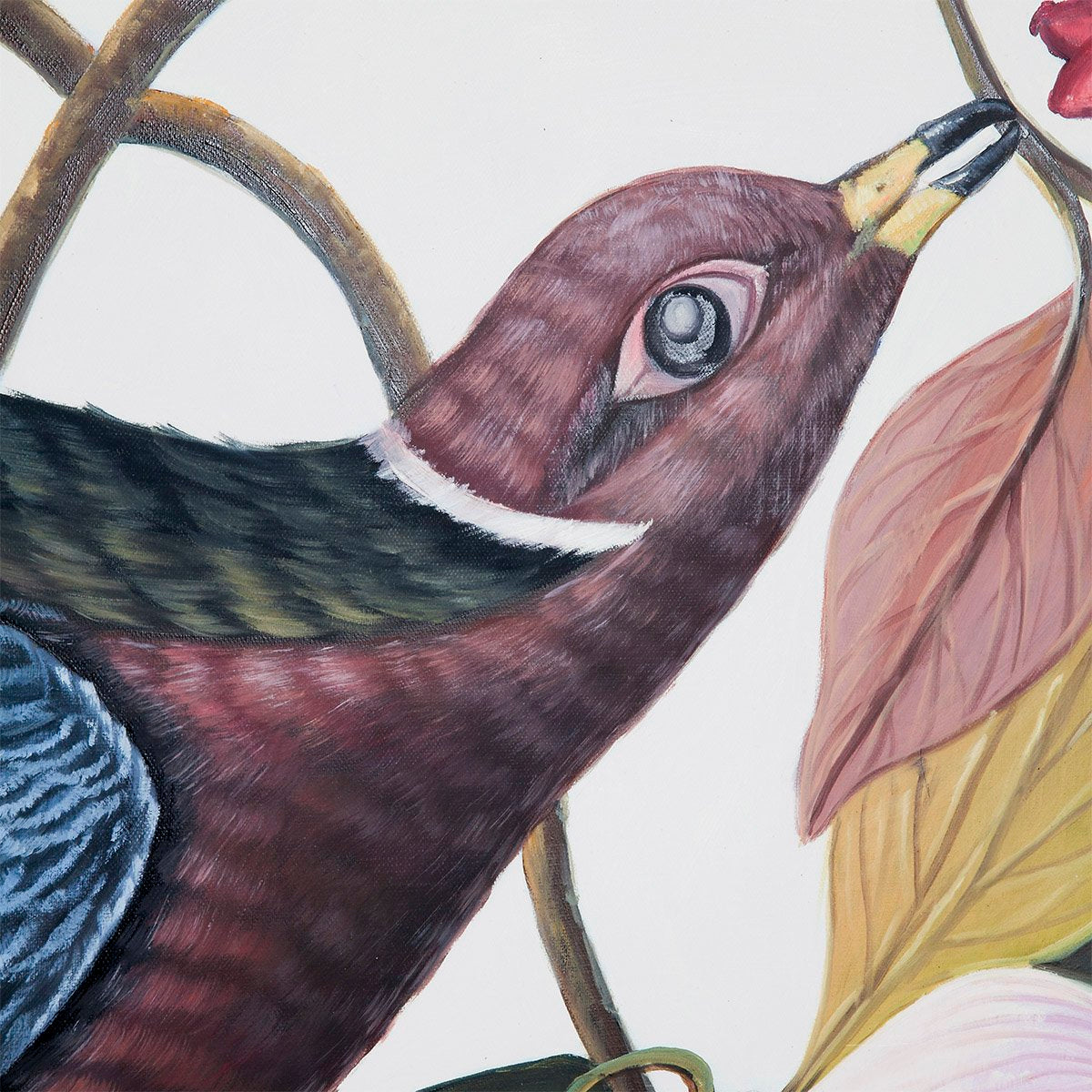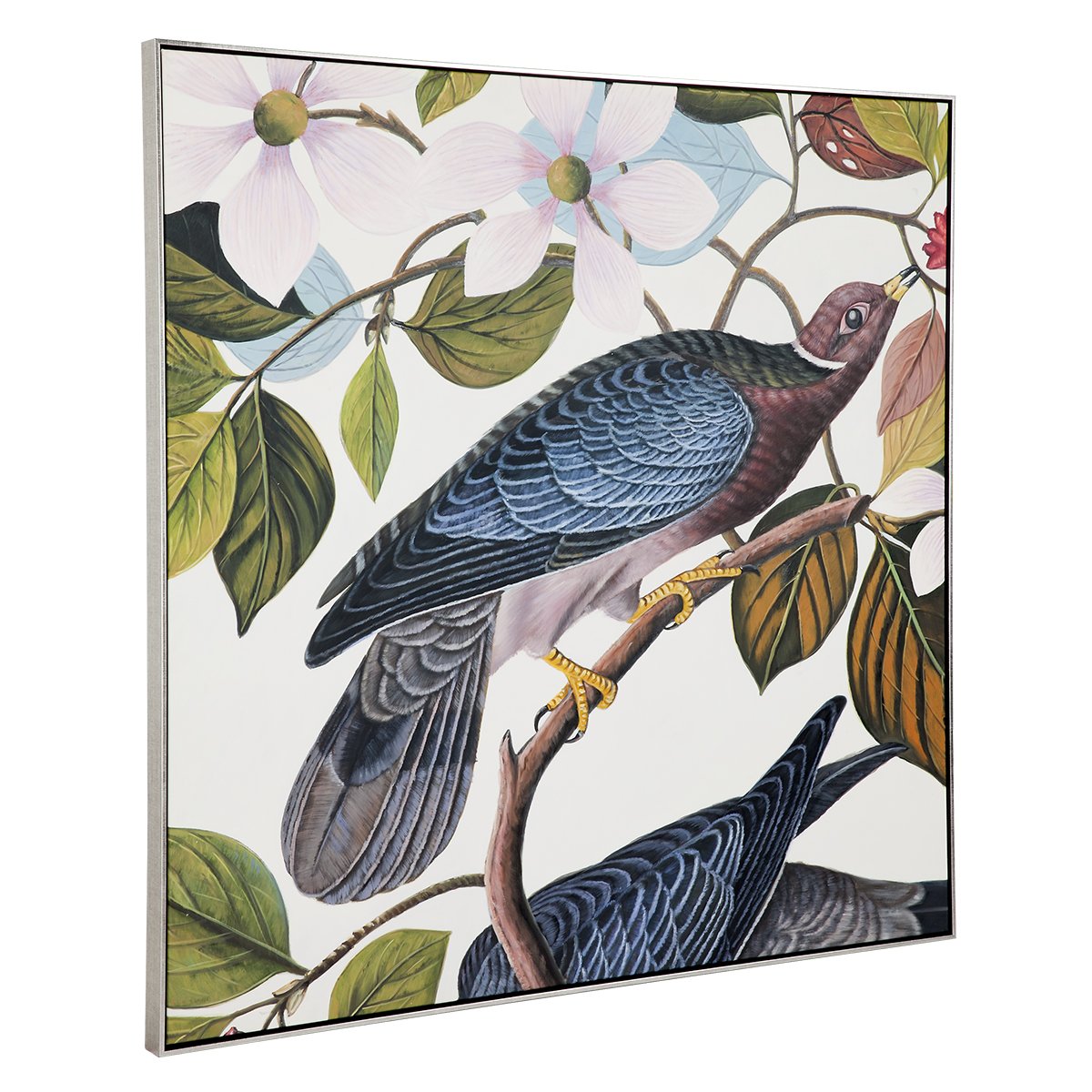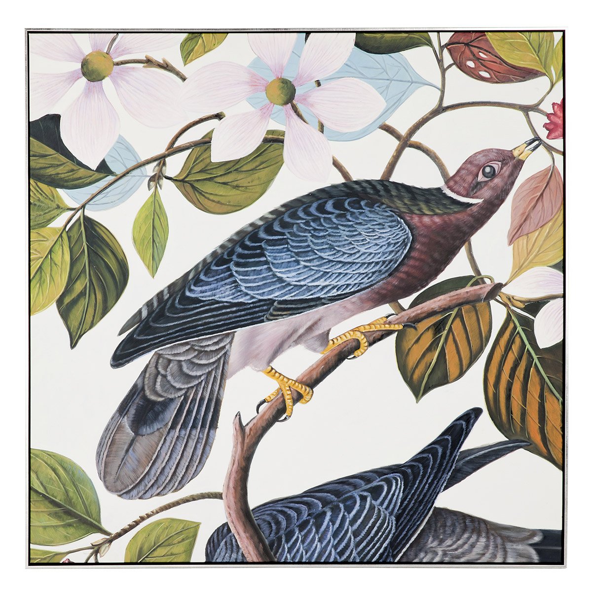 This modern take on striking birdlife, as captured in vintage encyclopaedias of old, is absolutely breathtaking. The detailed feather brush strokes and attention to detail of this piece are truly magnificent. Gentle tones of vanilla, blush and smokey blue are warmed by earthy tones of olive and terracotta, with hints of vibrant berry. Equally appropriate for classic or contemporary interiors, the substantial Band Tail oil on canvas is individually painted by skilled artists and displayed in an elegant antique silver shadow box frame.