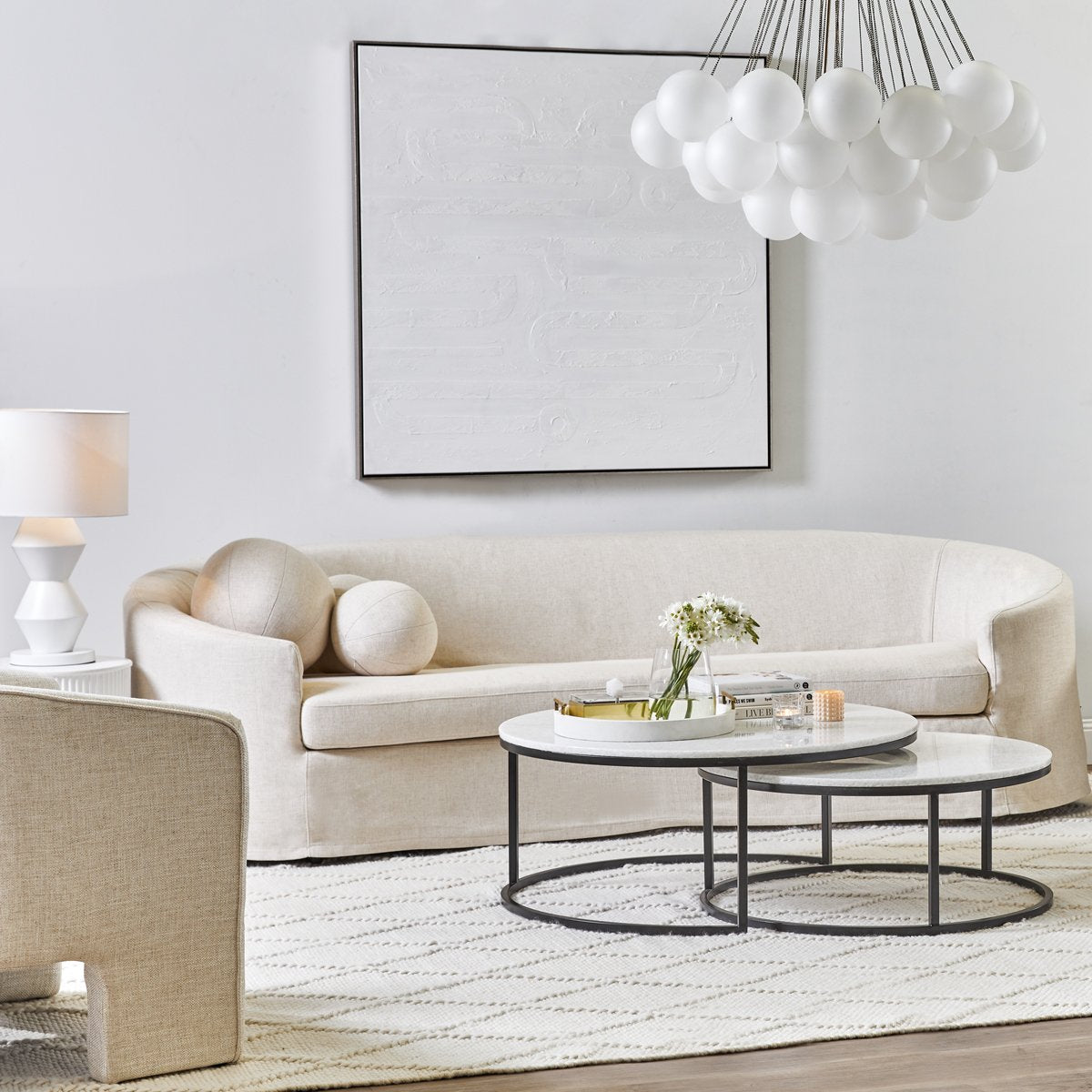 This beautifully adaptable nest of two coffee table set has been finished with a striking black powdercoated frame and natural crystallised stone tabletops. The fantastic nesting ability allows for a practical and versatile living piece.