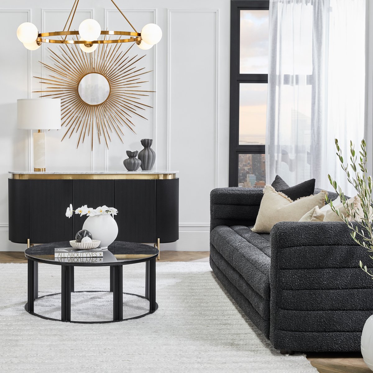 An enduring example of expert craftsmanship, the Demarco buffet boasts contemporary curvature and style with its mid-century modernism profile and detailed ribbed facing finished in a chic black satin. The attention to detail on this sleek and sophisticated piece adds to its confident charisma. Streamlined brass finished iron legs and slender gold plinth support a perfectly curved white Carrara marble top adding striking contrast to this timeless combination. Concealing a fixed shelf and co-ordinating black finished interior, the Demarco buffet offers ample storage and is a glamourous testament of elevated form and function.