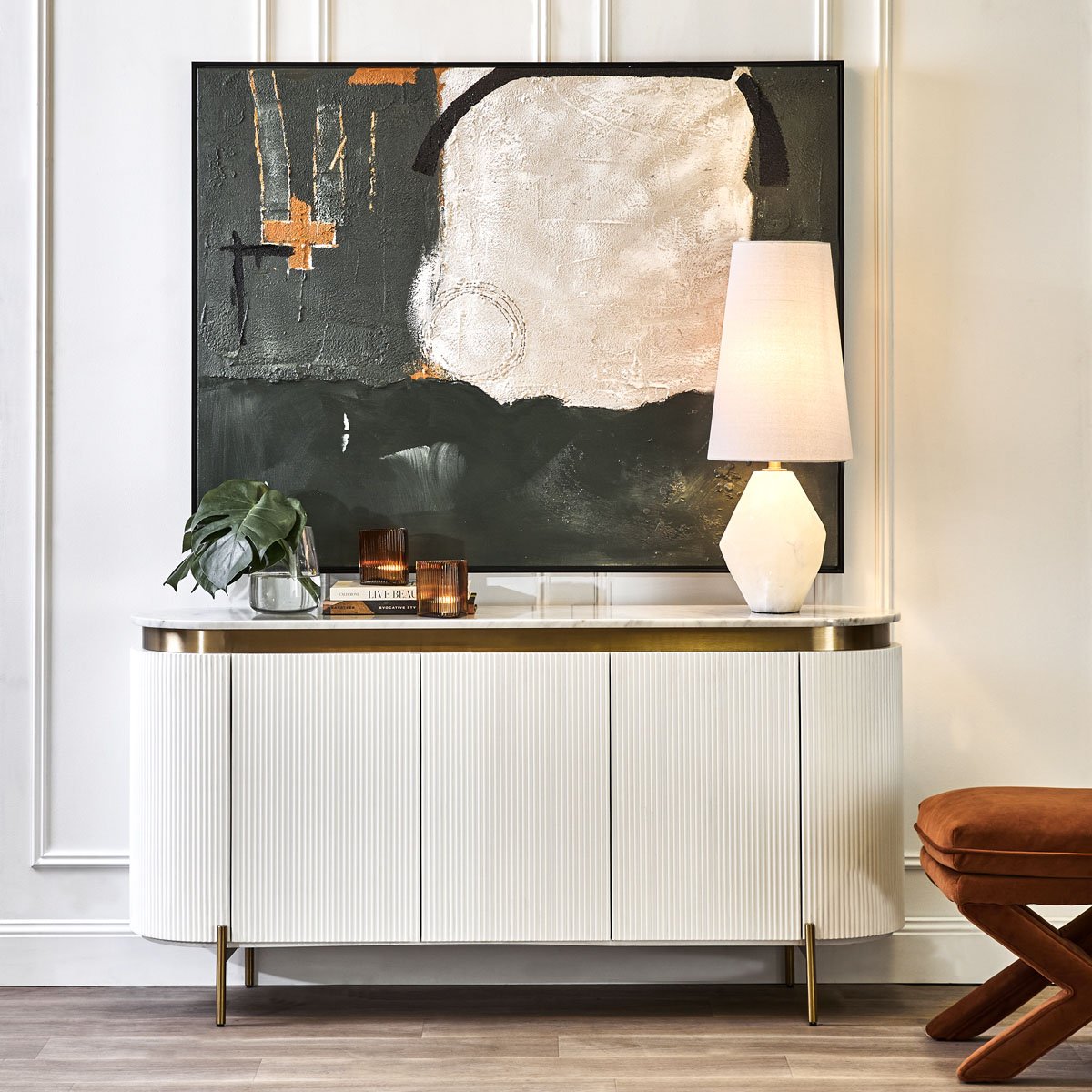 An enduring example of expert craftsmanship, the Demarco buffet boasts contemporary curvature and style with its mid-century modernism profile and detailed ribbed facing in an ethereal shade of white. The introduction of warm metallic highlights through the streamlined brass finished iron legs and slender gold plinth further elevate this sophisticated piece adding gentle glamour. Finished with a perfectly curved white Carrara marble top, the Demarco buffet offers undeniable modern elegance with its sleek frame, curved texture and refined detailing. Concealing a fixed shelf and co-ordinating white finished interior, the Demarco buffet provides ample storage and is a testament of superior form and function.