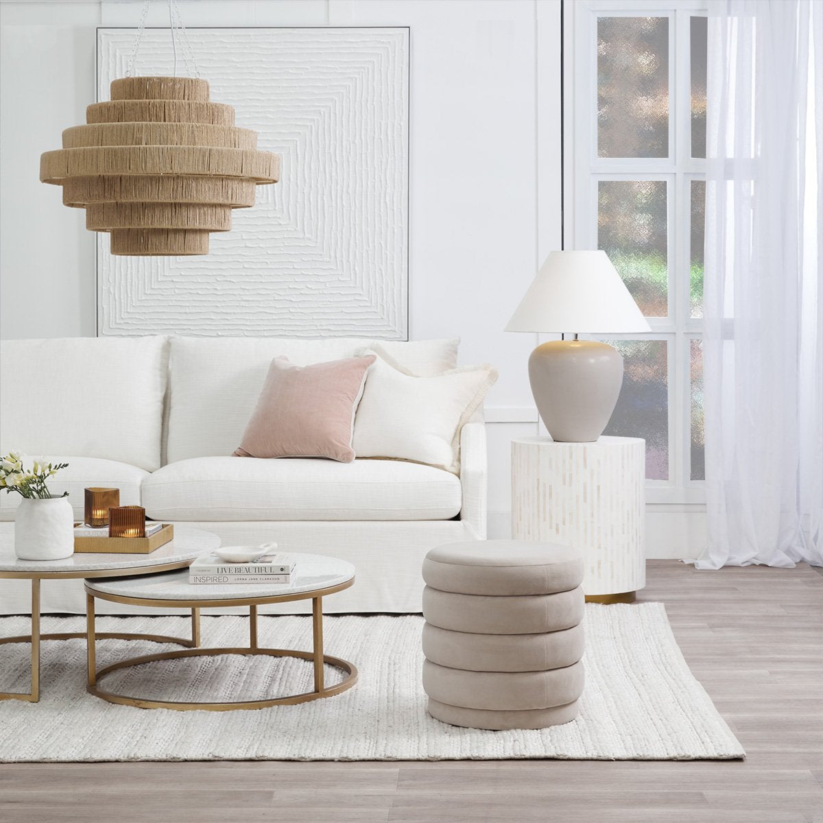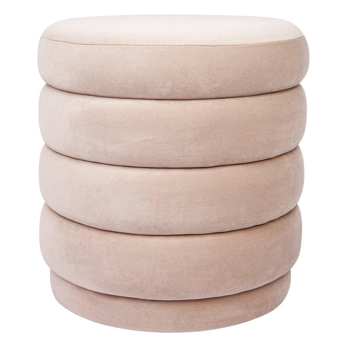 Upholstered in a luxurious nude velvet fabric, the perfectly proportioned Demi stool lends a sense of sophistication to any space. Designed with an effortlessly chic cosmopolitan mood in mind, the panelling detail of the Demi stool enhances its textural quality and adds to its contemporary feel. Ideal for adding personality to a bedroom, living room or as additional seating, the Demi stool works to bring modern character to a range of interior aesthetics. Also available in white boucle, off white linen, black or olive velvet.