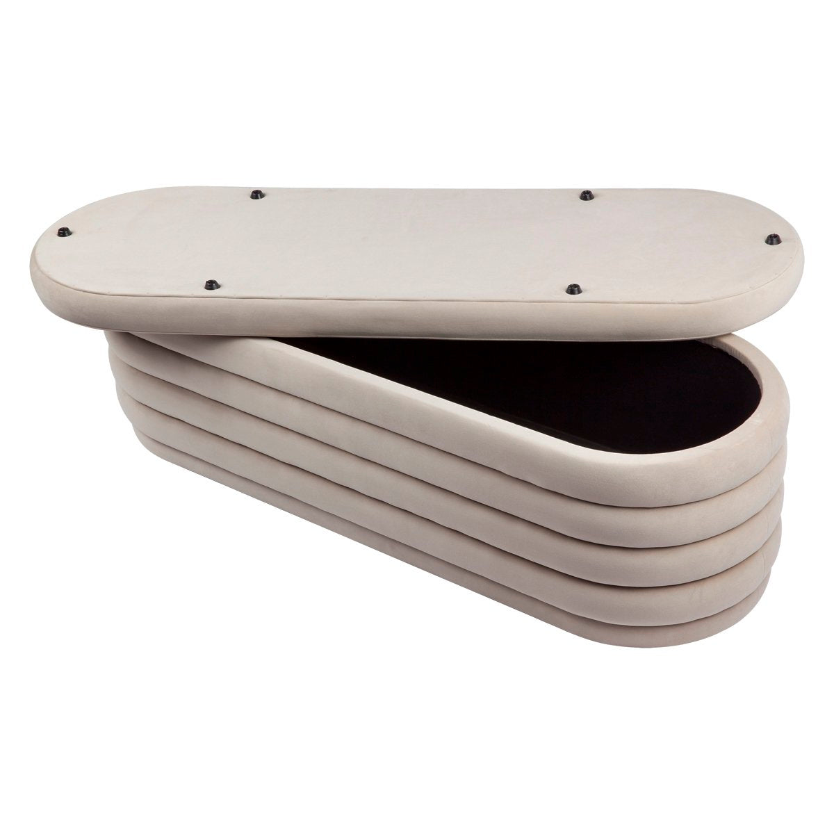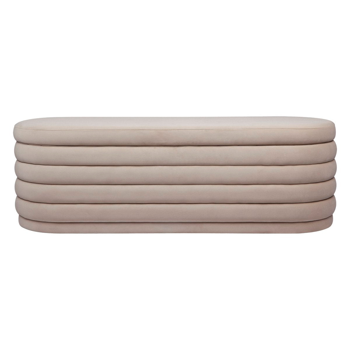 Upholstered in sumptuous nude velvet, the gentle tones and softened profile of the Demi storage bench ottoman lends a sense of sophistication to any space. Designed with an effortlessly chic cosmopolitan mood in mind, the panelling detail of the Demi storage bench ottoman enhances its textural quality and adds to its contemporary curve appeal. As practical as it is beautiful, lift the lid on the Demi to reveal ample storage - easy access for throws and cushions when styled as a bed end, hats and shoes when adorning a stylish entry or an Ideal hiding spot for books and games when used as additional living room seating. Also available in black or olive velvet, tactile white boucle and off-white linen.
