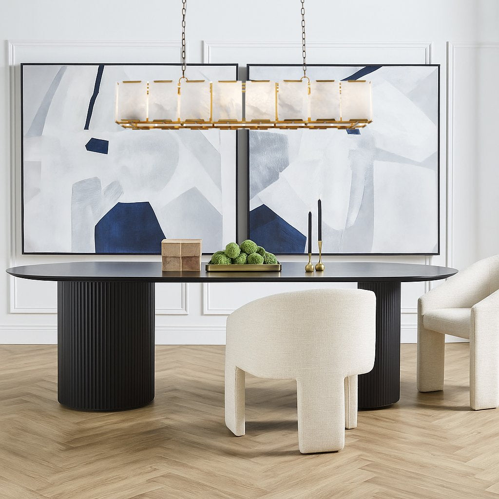 A showstopping collection; simple elegance, the Florence Alabaster Range is a modern take on classic silhouettes. Available as a collection to adorn multiple rooms or as individual conversation starters. The Florence Alabaster Pendant - Linear Gold features sharp, clean alabaster stone is framed by equisite metal framework to create a functional showpiece. Exemplifying sophistication, this pendant is a dreamy addition above our Leeton Dining Table or a kitchen bench, As every piece is unique, there will be colour or pattern variations - this is not a fault, simply part of the natural stone's beauty.