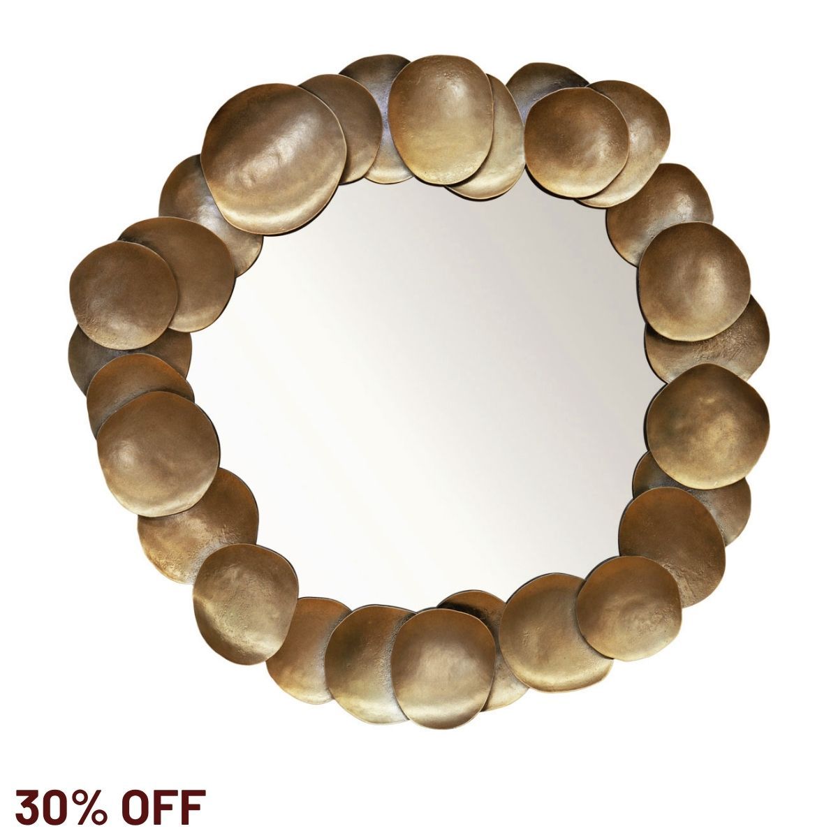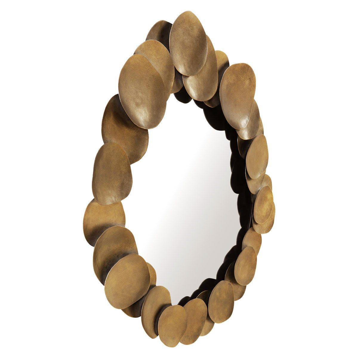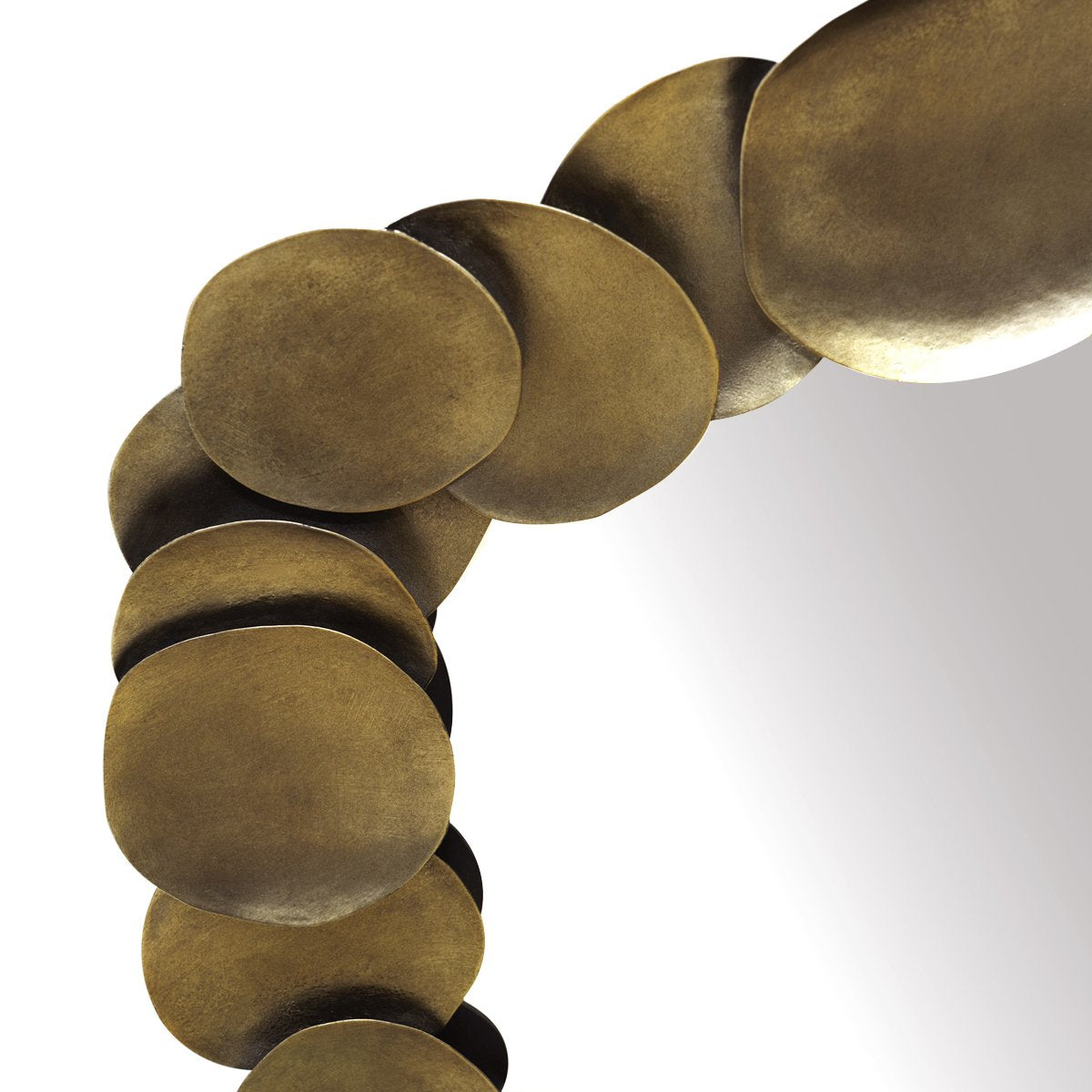 Embracing modern moods, the Halo wall mirror features hand-cut circular iron discs in an elegant aged gold textured finish, meticulously arranged in an organic circular formation. Embellishing interiors with distinctive sculptural style, the Halo wall mirror creates a striking accent perfectly placed in an entry, living or bedroom setting.