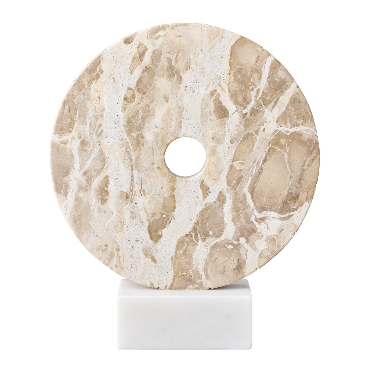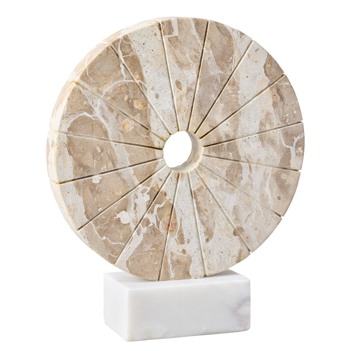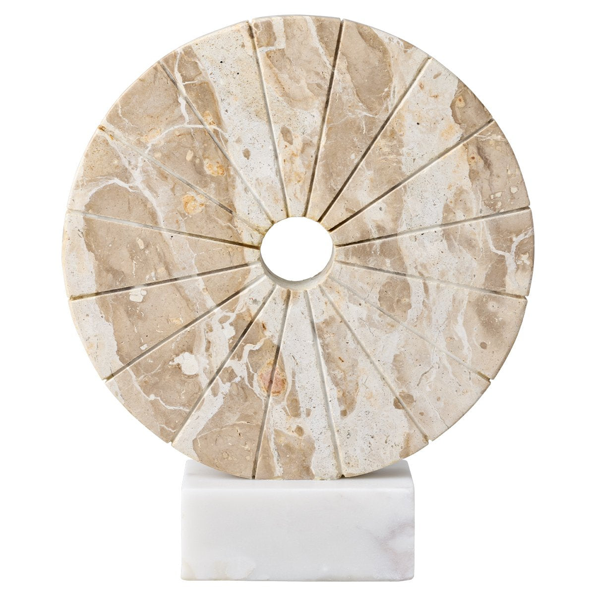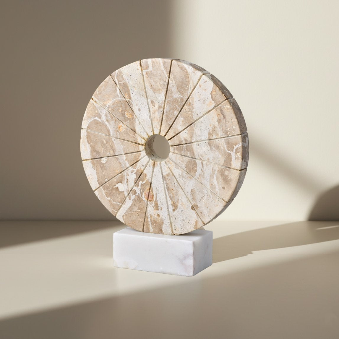 The Helios Object is a sculptural accent piece crafted from solid marble in Capri Beige and White. Inspired by radial symmetry, its circular form features carved lines that converge into a central cut-out, creating depth and visual interest. Elevated on a block base, it adds a touch of modern geometry and natural texture to consoles, shelves, or display tables. A refined decorative piece that blends artisan craftsmanship with timeless design.