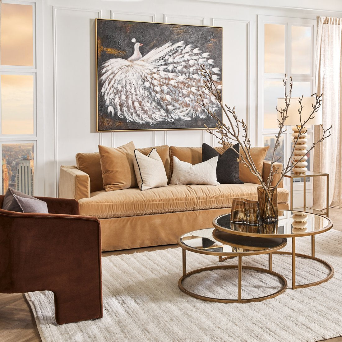 Symbolising beauty, grace, integrity and courage, the Le Grande Peacock oil on canvas painting creates a striking backdrop at 148 x 118cm. An elegant addition to any living or bedroom space, Le Grande Peacock resonates with classic, bohemian or French style interiors. Featuring meticulous white brush work over a contrasting blackened background with glimmering gold highlights, each piece is individually hand painted with oil on quality cotton canvas. Finished in an elegant antique gold shadow box frame, Le Grande Peacock adds a touch of eclectic charm and whimsy to modern interiors.