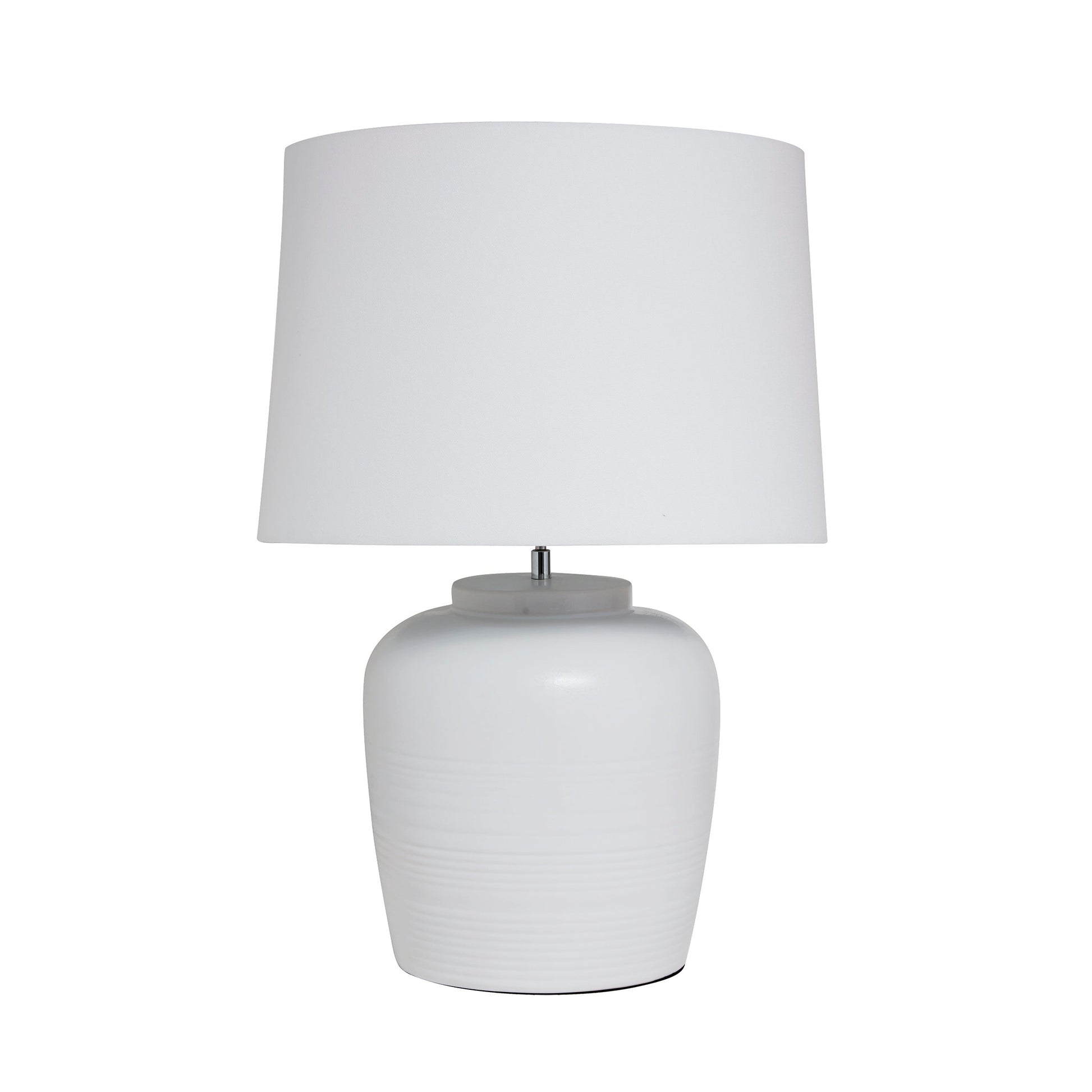 Add a touch of timeless elegance to your space with this ceramic table lamp. Featuring a sleek matte white base with delicate textural detailing and a classic white fabric shade, it emits a soft, ambient glow that creates a warm, inviting atmosphere. Perfect for bedrooms, living rooms, or offices, this lamp's neutral tones and versatile design effortlessly blend with any décor style. Whether you're seeking functionality or a decorative accent, this lamp is the ideal addition to enhance your home's ambiance.