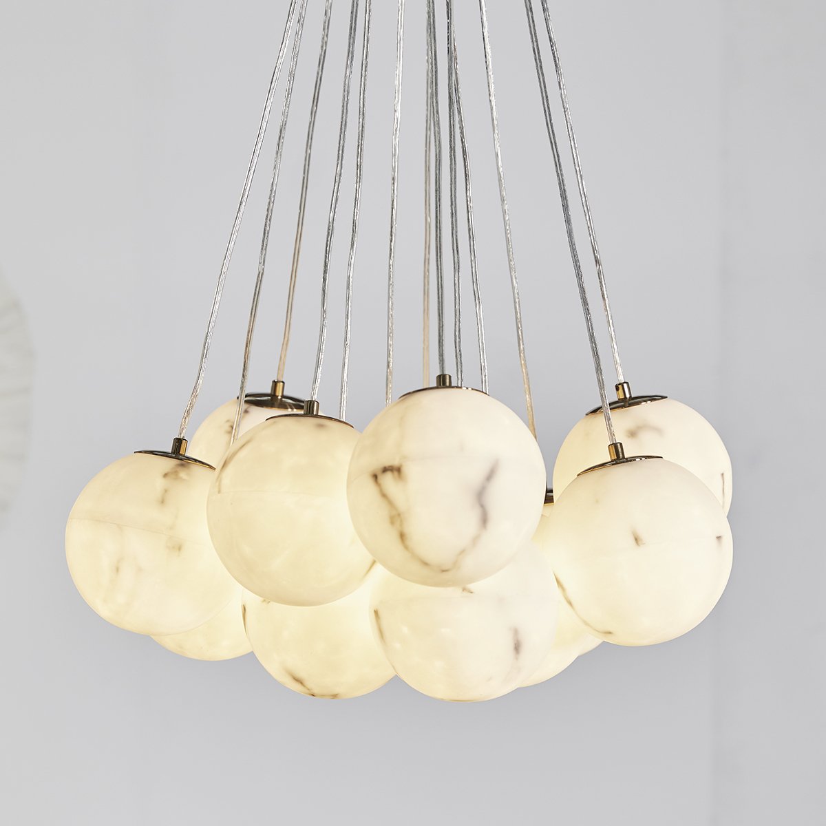 The Lucina Pendant Light features a stunning array of thirteen alabaster-look globes, each orb designed to provide a gentle, ambient illuminance. Suspended from a brushed brass canopy, this elegant chandelier adds sophistication to any living or dining space. The natural texture of each alabaster-look globe enhances its soft glow, creating a warm, inviting atmosphere. The Lucina is the perfect centrepiece for those seeking to blend timeless charm with contemporary elegance in their home decor.