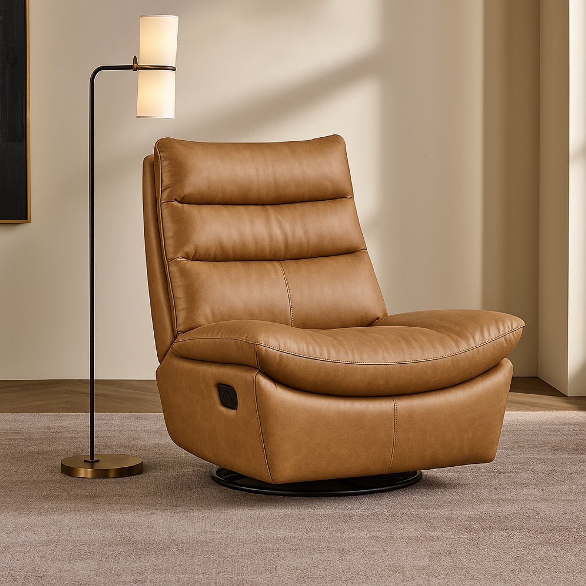 Unwind in luxury with this Lusitano recliner chair, expertly crafted in top grain cow leather for a refined and comfortable seating experience. Designed for both relaxation and style, its sleek silhouette features plush, channeled cushioning that provides exceptional support while enhancing its modern appeal. The ergonomic design and generously padded seat ensure a cosy, lounge-worthy feel, perfect for contemporary and classic interiors alike. This chair rocks and glides for added comfort, and features a manual pull mechanism to easily recline, making it an ideal choice for ultimate relaxation. Built for durability, the top grain cow leather offers a supple texture that ages beautifully over time. Whether styled as a standalone feature or as part of a coordinated range, this recliner chair brings effortless sophistication to any space. Available in light brown leather and cappuccino cream to suit a variety of interiors.