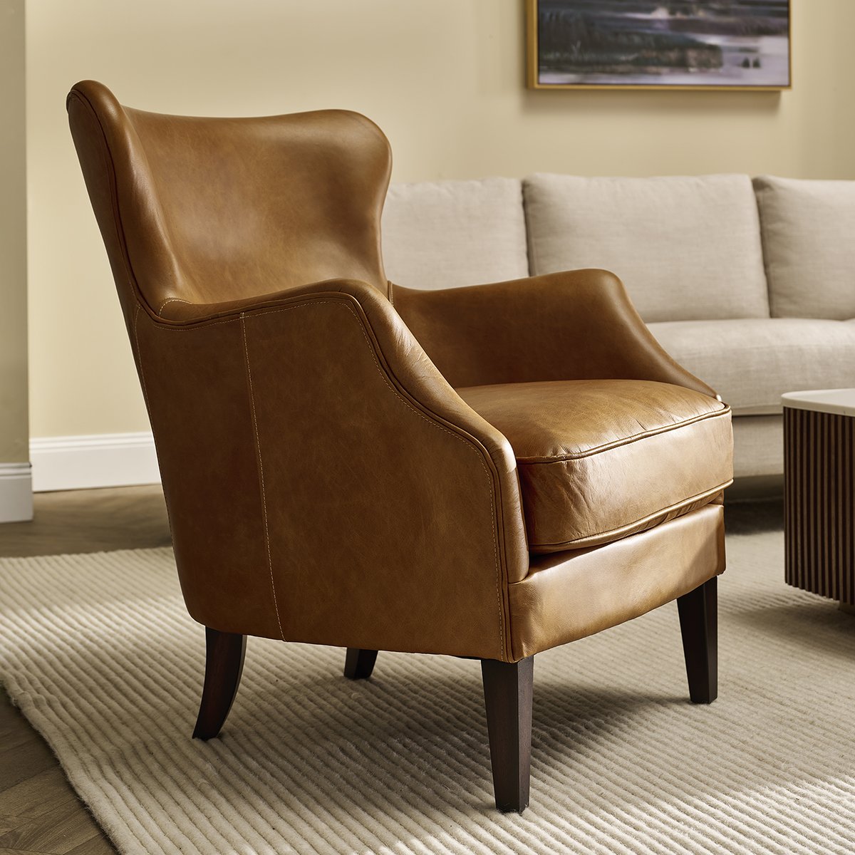 Crafted for timeless sophistication, this Marlon arm chair on light brown top grain cow leather brings warmth and elegance to any space. Featuring a sculptural wingback design with gracefully curved armrests, it combines refined aesthetics with exceptional comfort. The supple light brown leather showcases the natural beauty of premium cowhide, creating a rich, inviting texture that ages beautifully. Plush cushioning ensures superior relaxation, while sturdy wooden legs provide lasting stability. Perfect as a statement piece or paired with coordinating furniture, this armchair seamlessly suits both modern and classic interiors. Also available in dark brown.