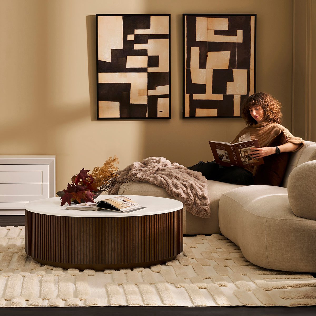 The Mason Round Coffee Table showcases timeless craftsmanship with a contemporary edge. Featuring a luxurious Sivec marble top with natural veining, it is set on a fluted oak wood base in a warm walnut finish, accented by a sleek metal gold plinth. Its round silhouette adds softness and balance to any space. Available in large and medium sizes, this piece offers versatile elegance, combining refined design with practical functionality for modern and classic interiors alike.