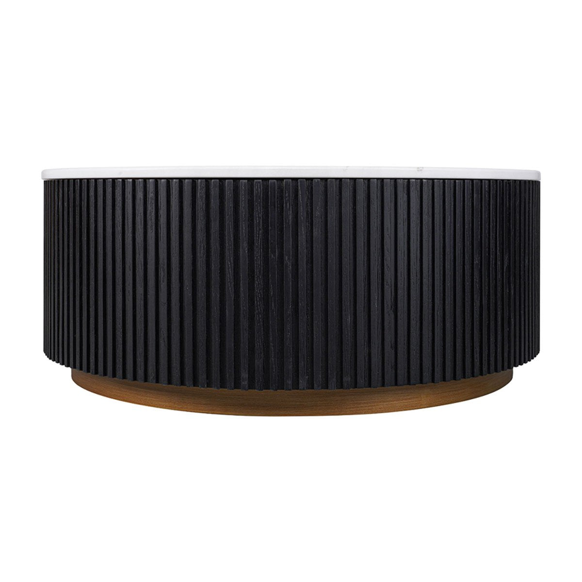 Elevate your living space with the Mason Round Coffee Table, a refined blend of modern design and timeless materials. Featuring a luxurious Sivec marble top with natural veining, it rests on a fluted oak wood base in a black finish, grounded by a subtle metal brushed antique gold plinth. Available in two sizes—large and medium—this table brings elegant contrast and texture to any setting, offering the perfect balance of durability, functionality, and sophisticated style.
