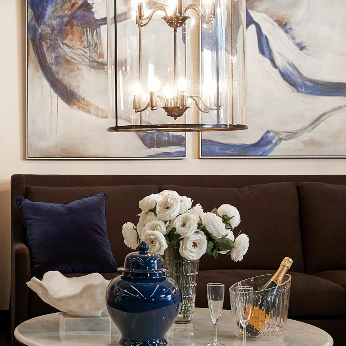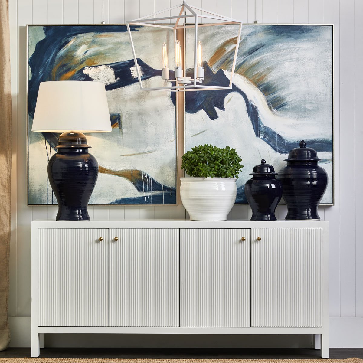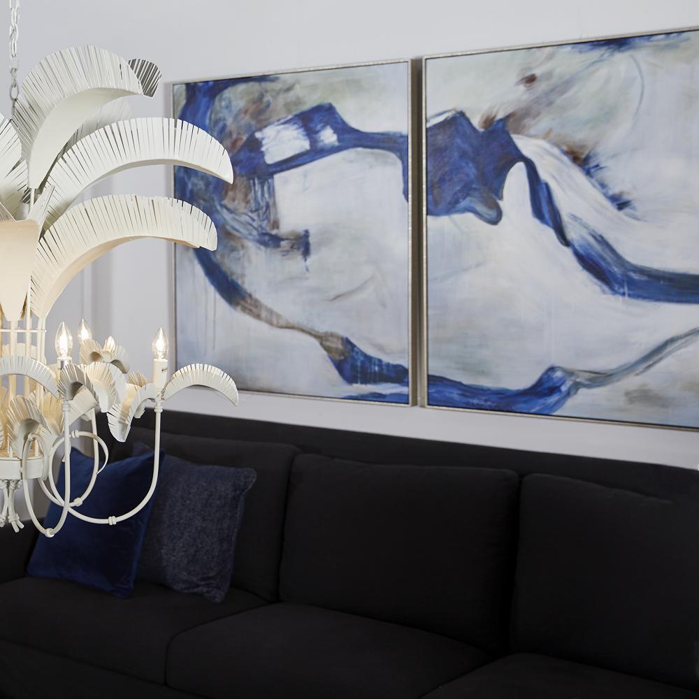 Ethereal movement creates a striking abstract composition in the Midnight Summer oil on canvas duo. Perfectly paired to be hung side by side for dramatic statement at a total of 2 metres wide, each part of Midnight Summer is individually enticing as a stand-alone piece. Featuring a fresh colour palette of rich blues and whites underpinned by warm tan tones, the Midnight Summer set is designed to infuse calm energy into any room with its gentle composition. Displayed in an elegant brushed antique silver shadow box frame, Midnight Summer is individually hand painted in oil by skilled artisans, so no two pieces are exactly alike.
