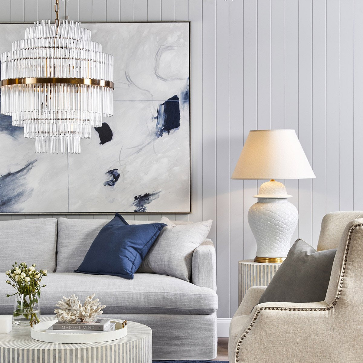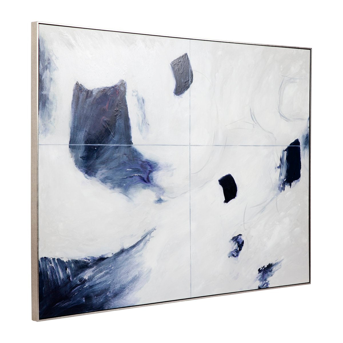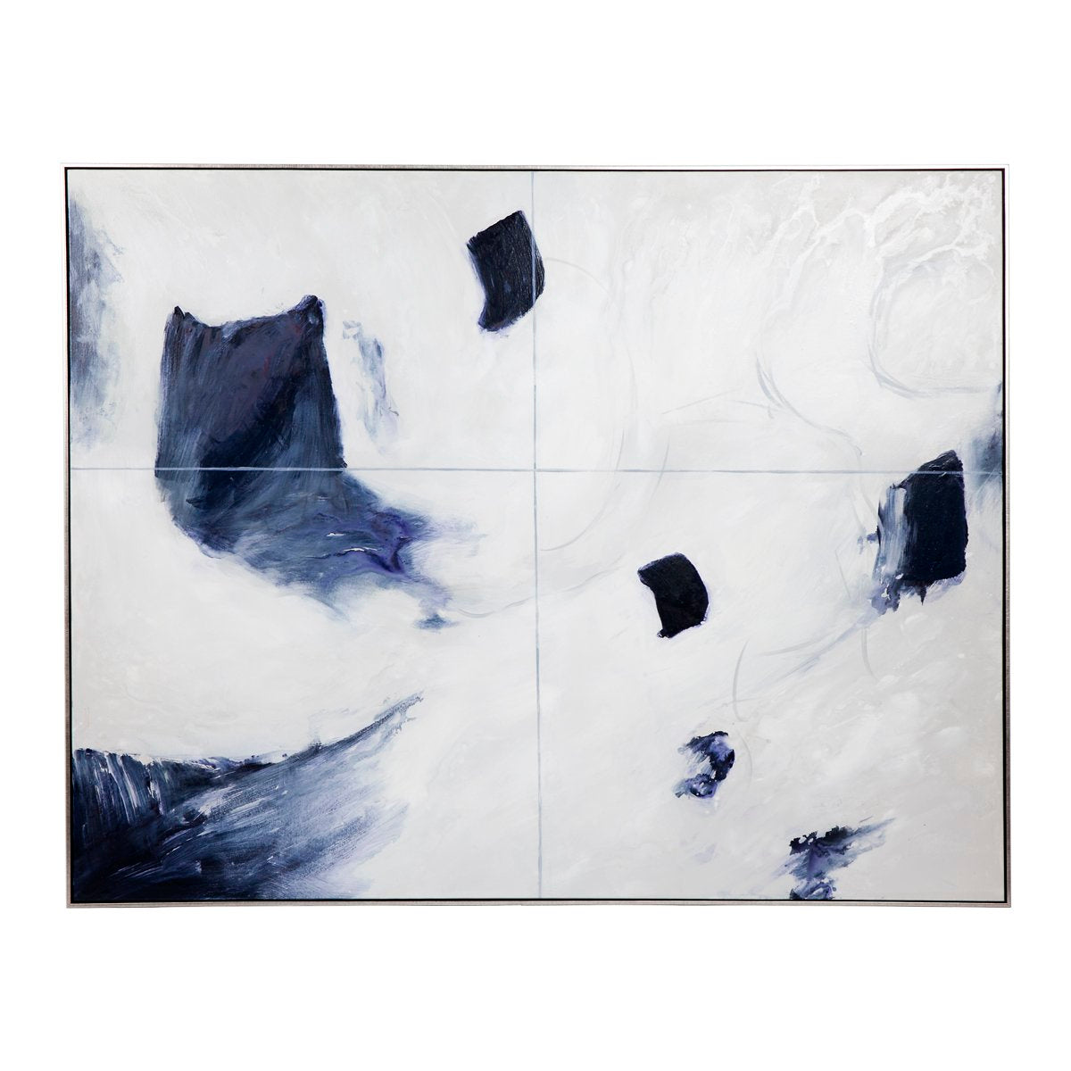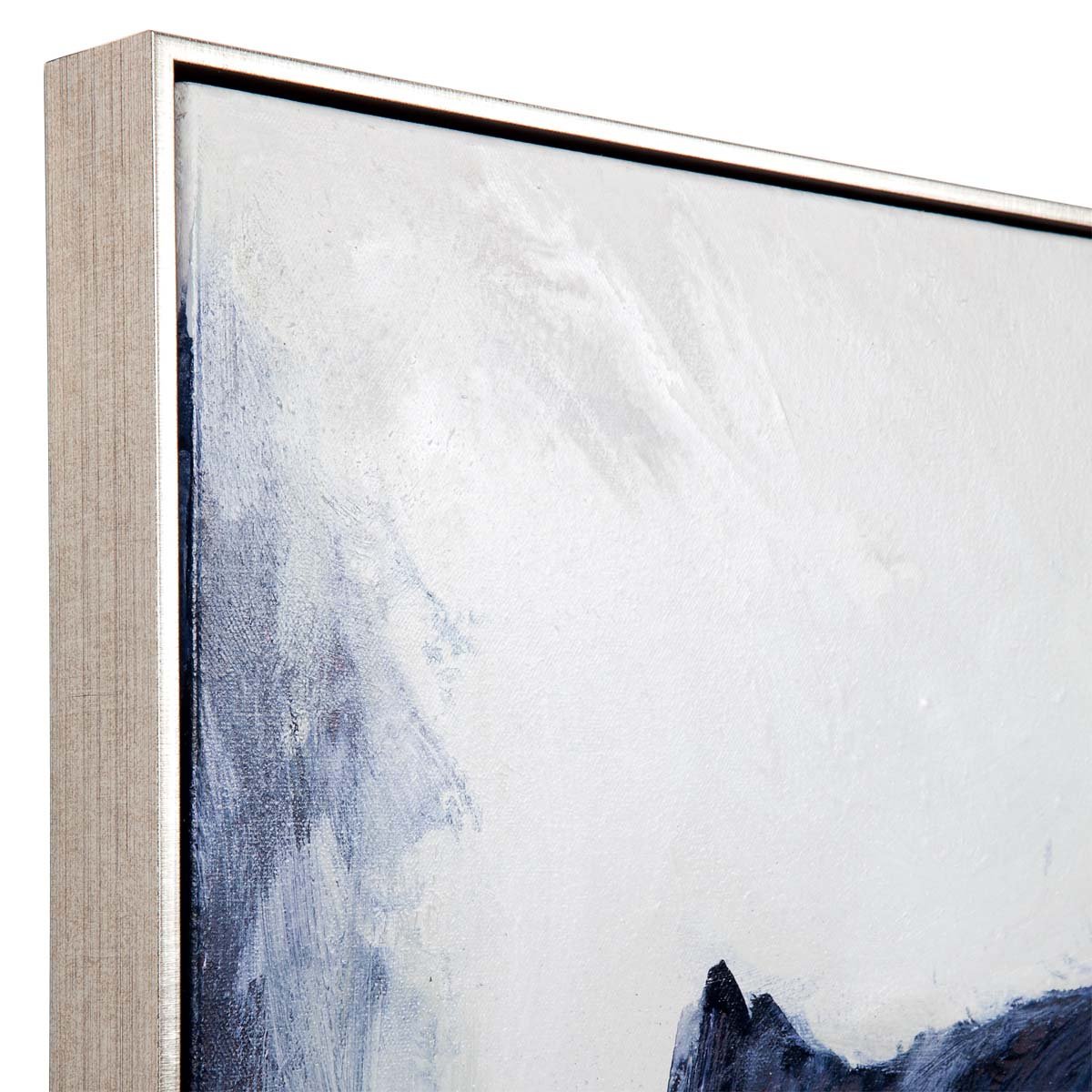 Moving Moments oil on canvas offers instant impact due to its ethereal tones, swelling forms and sheer size. An impressive 180 x 140cm, Moving Moments creates an alluring backdrop with its gentle colour palette and abstract form. Fluid brush strokes in subtle tones are interrupted by deep indigo moments offering striking depth and contrast. Beautifully displayed in an antique silver shadow box frame, Moving Moments would add contemporary character to any large entry wall, living or dining room setting.
