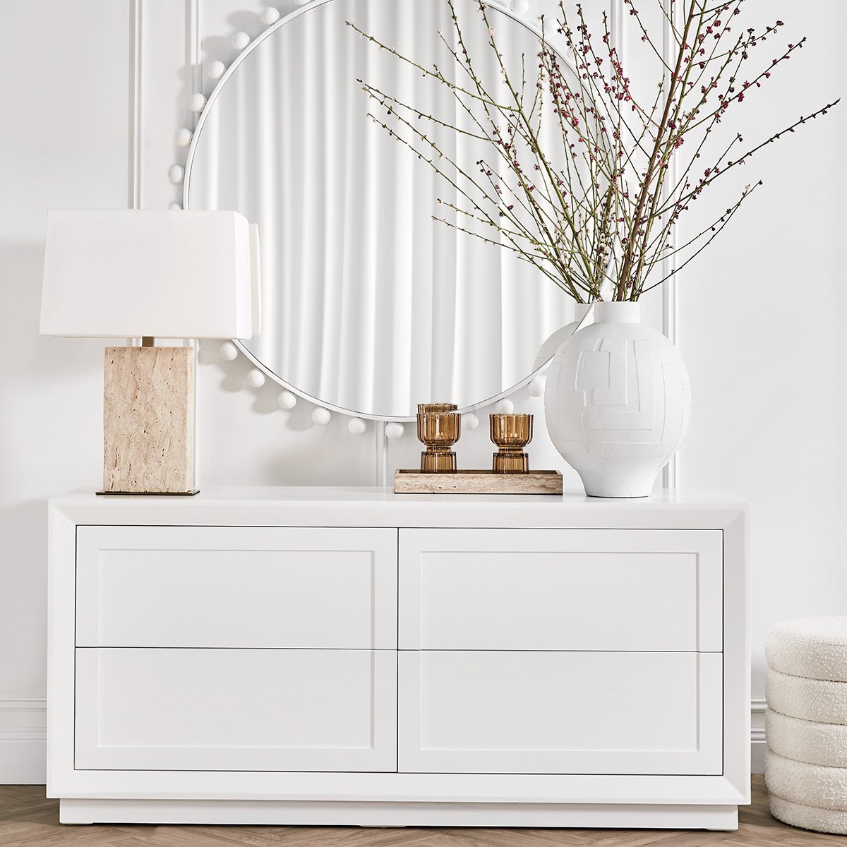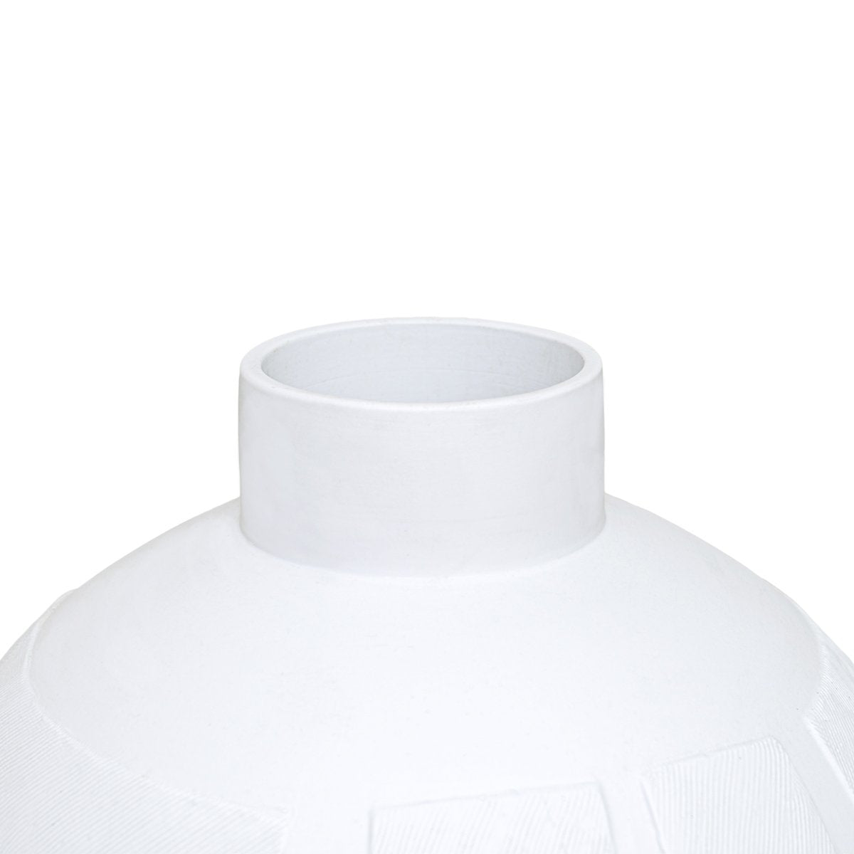 A substantial decorator piece at 35cm x 46cm high, Pandora’s beauty lies in her rounded curves and gentle organic texture bringing stunning sculptural style to indoor or outdoor rooms. Her matt plaster finish in off white ceramic is embossed with hand crafted Greek key geometric patterning embellished with a hatched linear detail that is highly tactile and visually captivating.