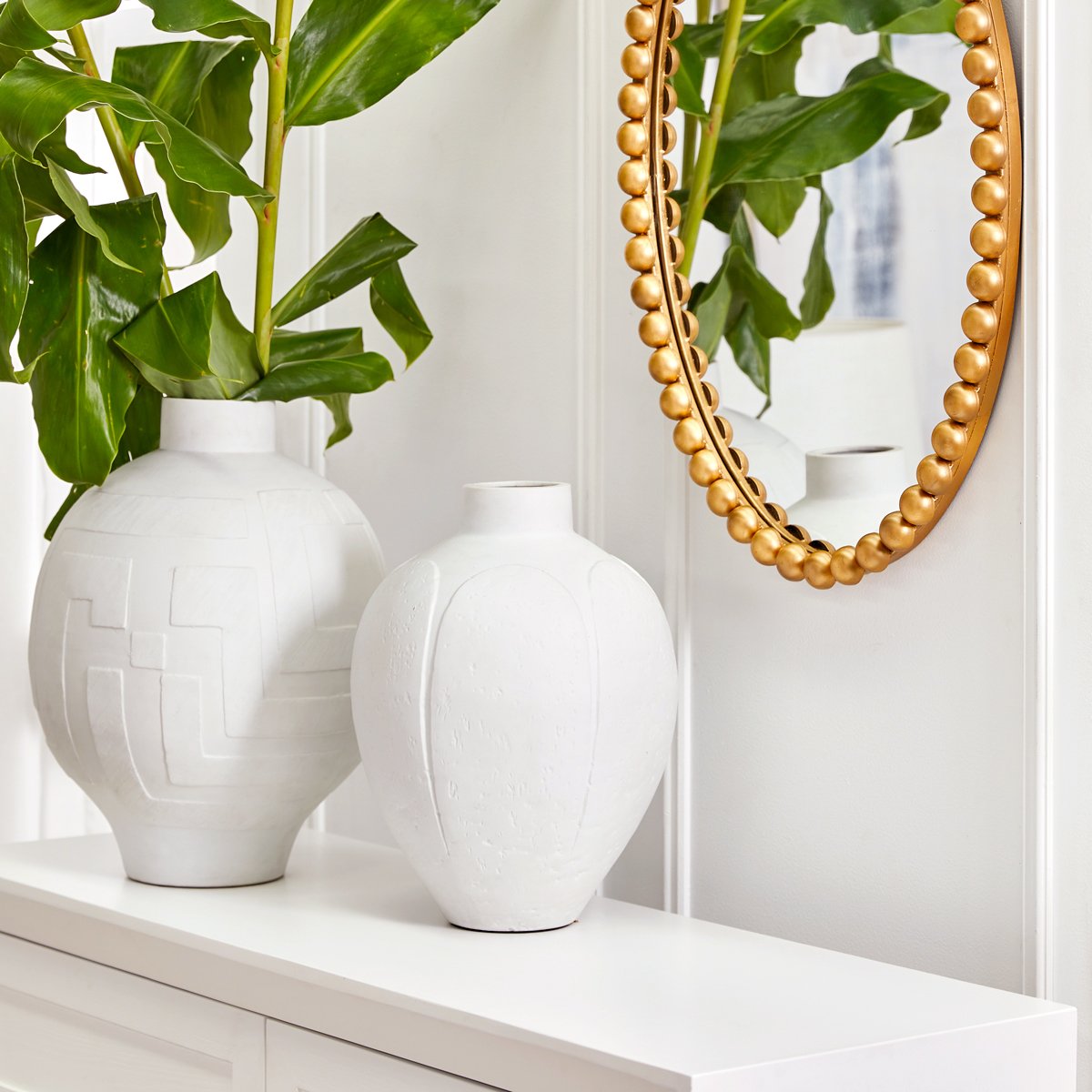 The beauty of the medium Pandora Greek key vase lies in the simplicity of her rounded curves and subtle organic texture which brings fresh, sculptural style to indoor or outdoor rooms. Pandora’s matt plaster finish in off white ceramic is embossed with hand crafted Greek key geometric patterning embellished with a hatched linear detail that is highly tactile and visually captivating. Available in 2 sizes, Pandora medium Greek key vase measures 30cm x 40cm high.