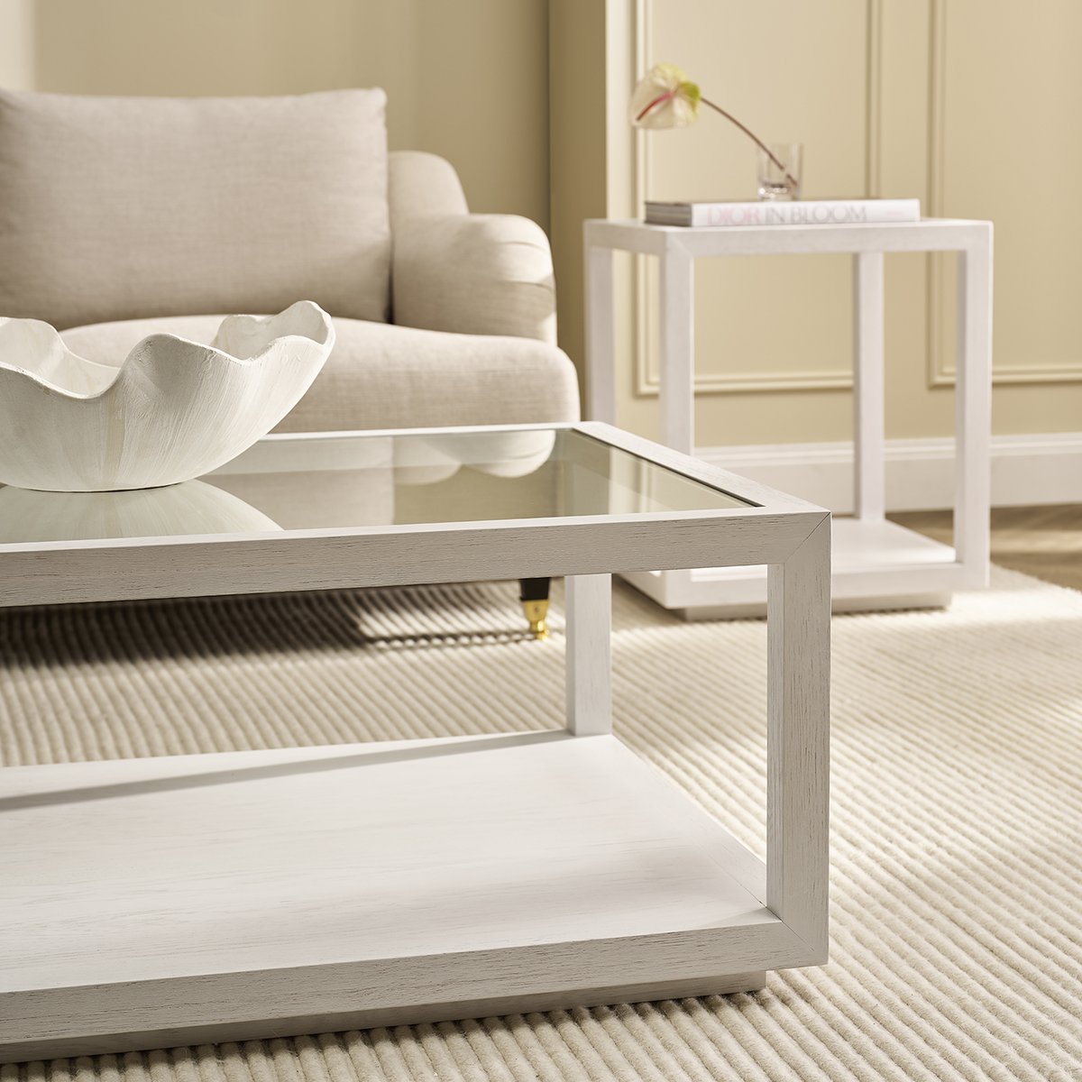 The Sadie Collection showcases a perfect balance of brushed oak wood and sleek tempered glass, designed to bring effortless sophistication to modern and classic interiors. Bringing this refined aesthetic into focus, the Sadie Rectangular Coffee Table features a brushed oak frame in a crisp white finish, adding a fresh and airy feel to any space. The crystal-clear tempered glass top enhances natural light, creating an open and elegant look, while the lower oak shelf offers practical storage or a display surface for curated décor. With clean lines and a minimalist silhouette, this coffee table seamlessly integrates into contemporary and traditional interiors, making it a statement piece that embodies both function and style.