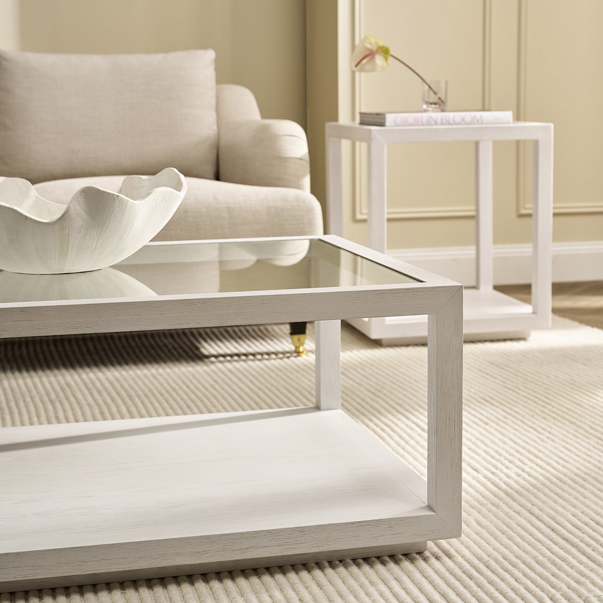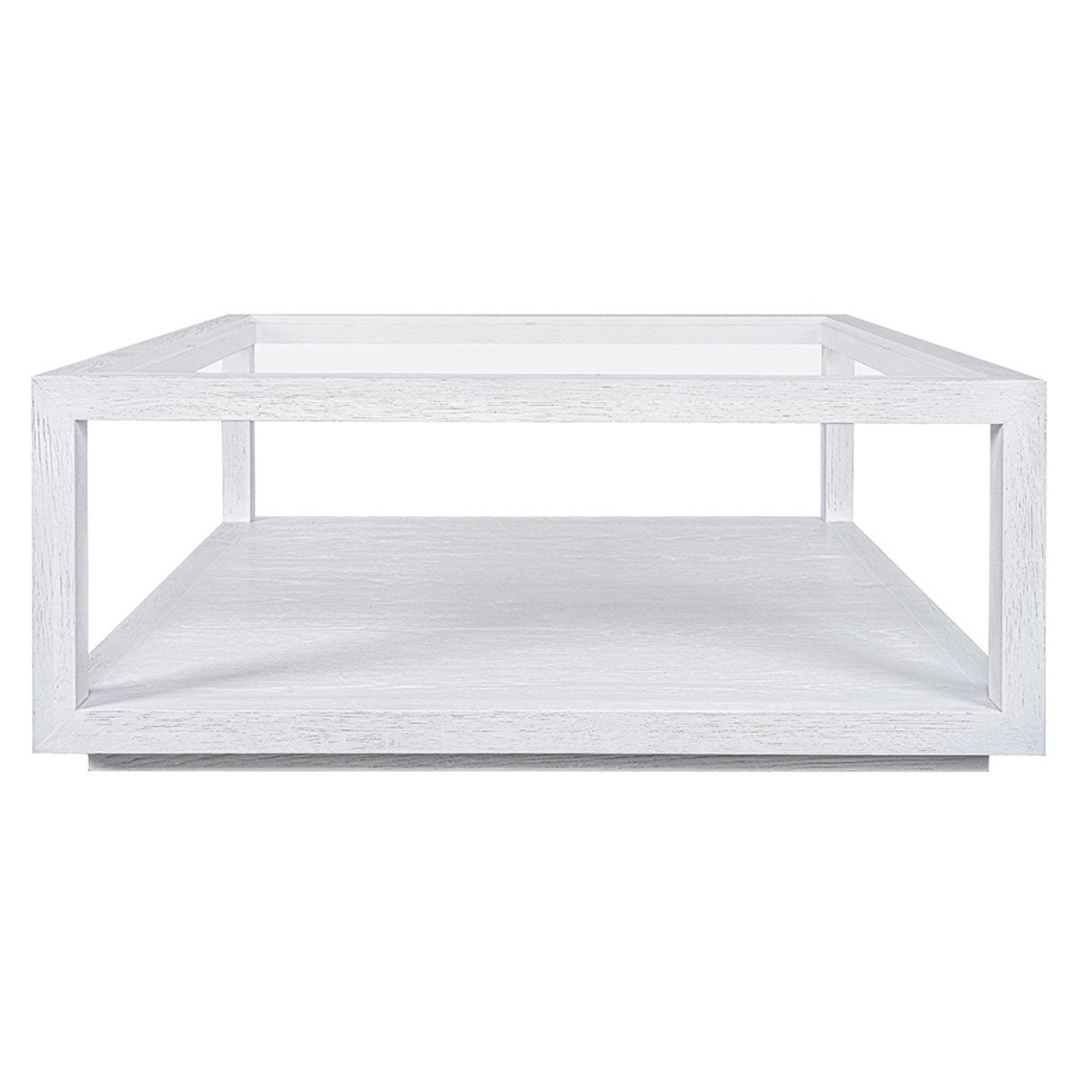 The Sadie Collection showcases a perfect balance of brushed oak wood and sleek tempered glass, designed to bring effortless sophistication to modern and classic interiors. Bringing this refined aesthetic into focus, Sadie Square Coffee Table features a white brushed oak frame, offering a fresh, airy elegance that brightens any space. The crystal-clear tempered glass top enhances the lightness of its design, creating an open and spacious feel. Designed for both style and functionality, the lower shelf offers additional space for storage or curated displays, making it an elegant yet practical centrepiece. Its minimalist silhouette integrates seamlessly into curated interiors, enhancing any living space with a touch of timeless sophistication.