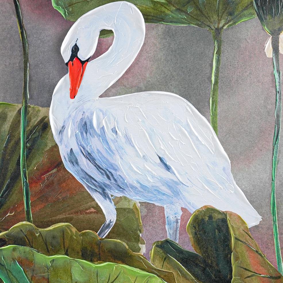 Celebrate elegance with Shay's exquisite swan-inspired artwork, an intricate blend of delicate textures and vibrant hues. This captivating piece, crafted by renowned American artist Shay, reflects her transition from a celebrated Cordon Bleu chef to a masterful painter. Featuring serene lotus blossoms and a graceful swan, the painting exudes tranquillity, inspired by the lush beauty of nature. Perfect for contemporary or classic interiors, Shay's art combines culinary precision with artistic flair, creating timeless décor for your space.