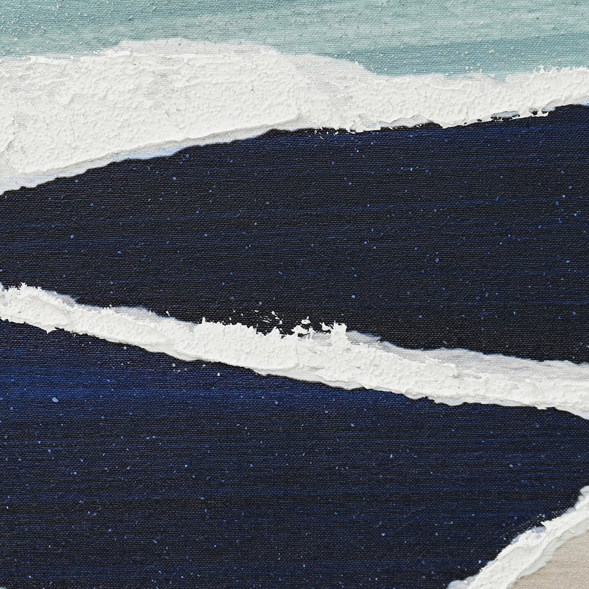 Experience the vibrant beauty of this expressive impressionist artwork, featuring bold curved brushstrokes in aquamarine, sand, and teal that evoke the essence of a serene seascape. Expertly mounted in a stylish antique silver shadow box frame, this piece adds a touch of elegance and sophistication to any space