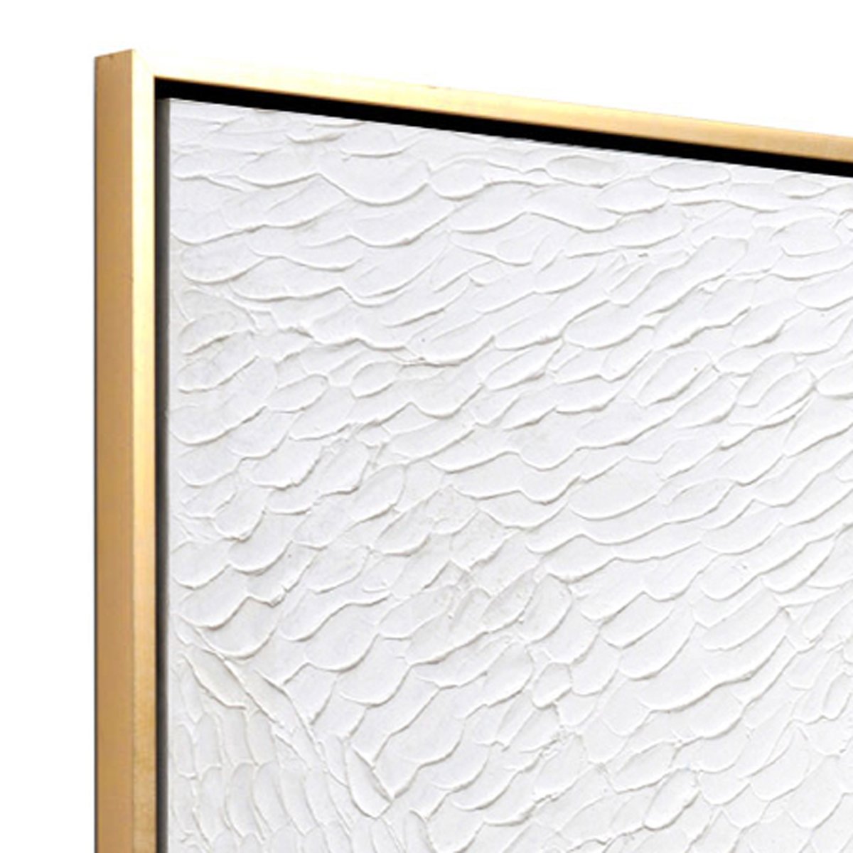 Snow White canvas painting infuses interiors with a sense of serenity. A beautifully textured artwork, Snow White offers a calming statement in any interior. Mounted in a striking gold shadow box frame for a touch of luxe. Available in two sizes.