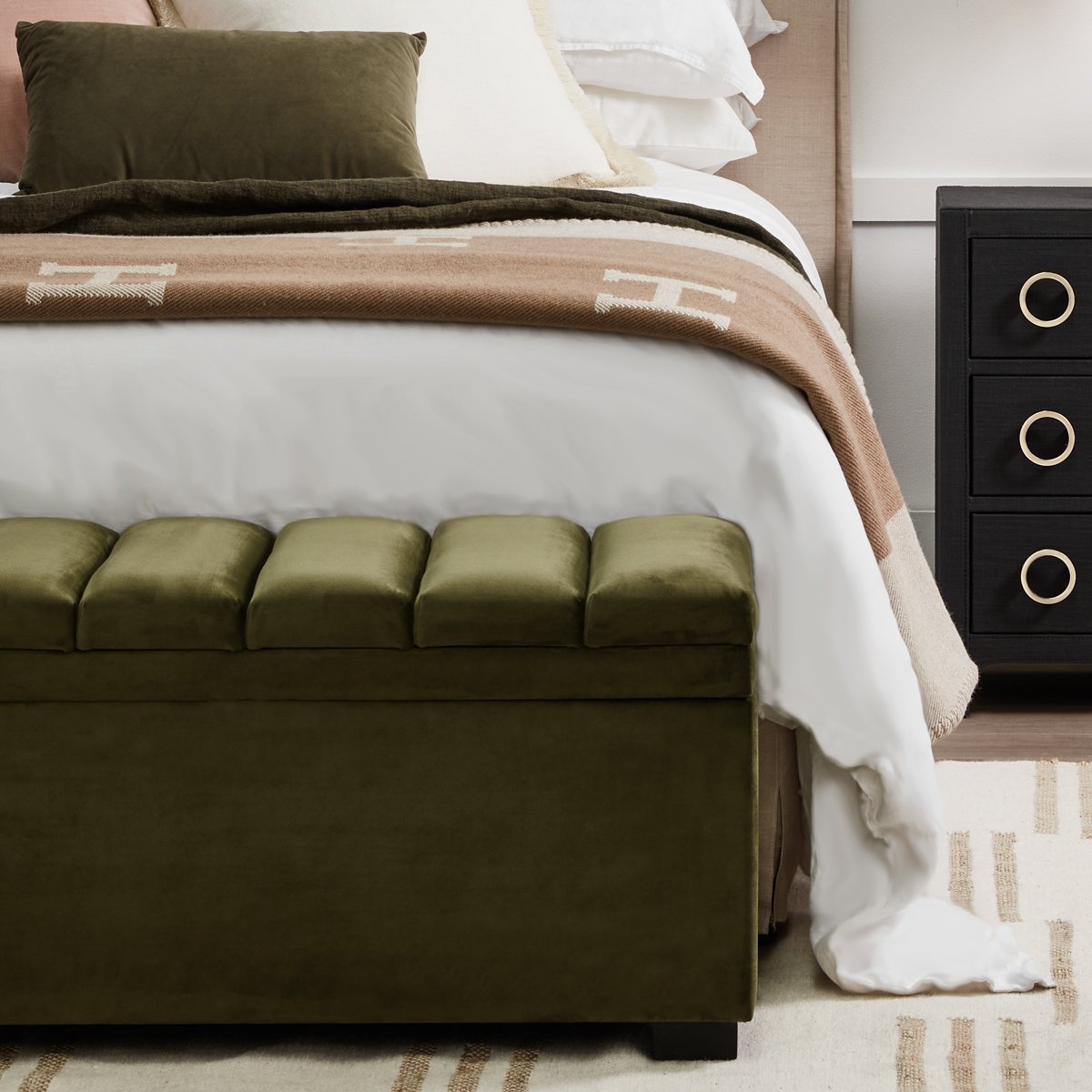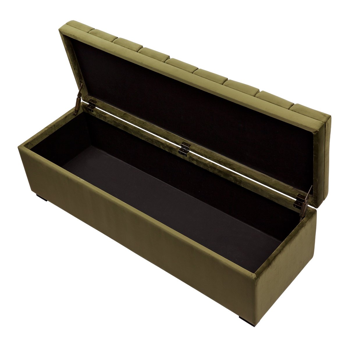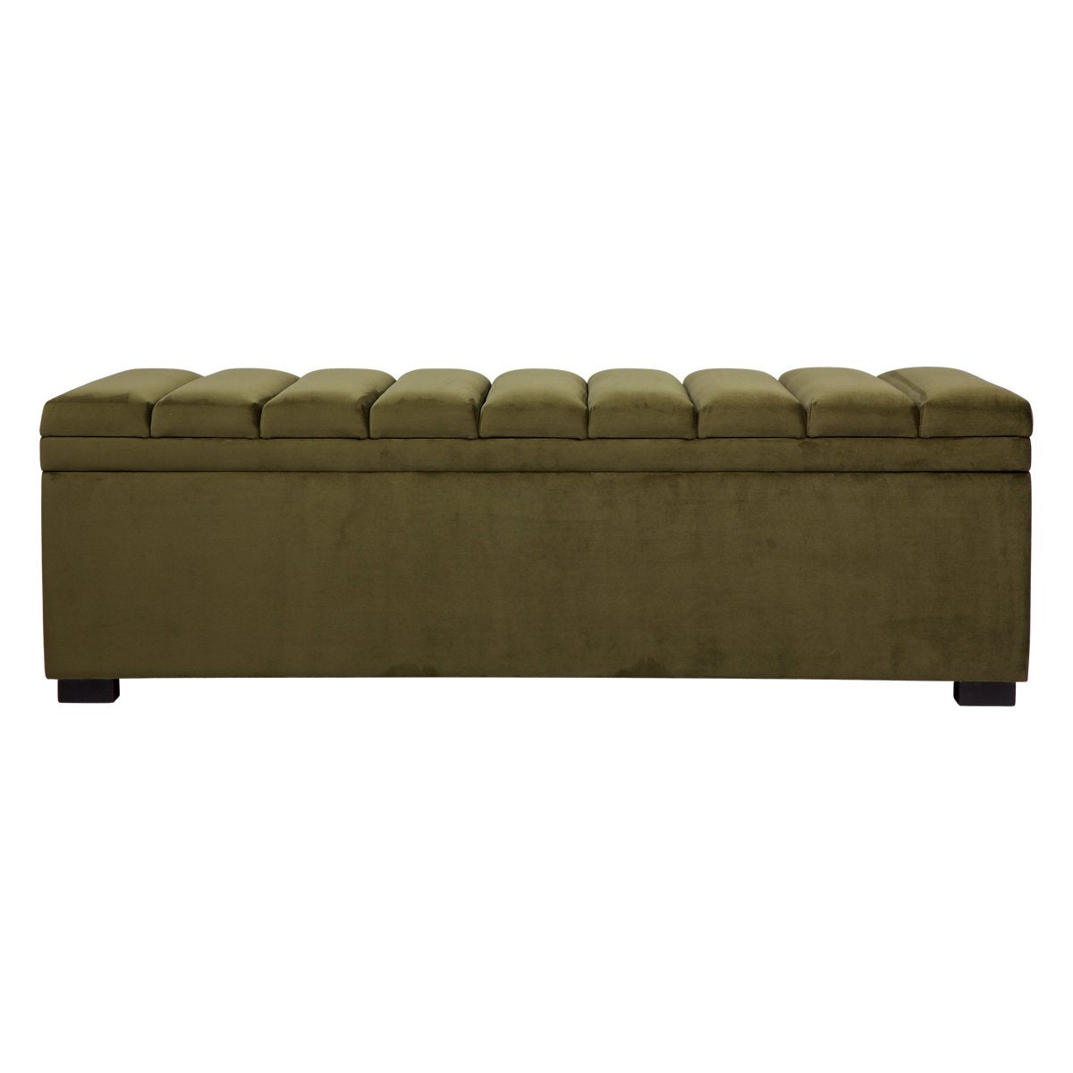 Upholstered in a dreamy olive velvet, the Soho storage bench ottoman features a luxuriously panelled top which lifts to reveal ample storage - creating a furniture piece that is both beautiful and functional. Classic contemporary in design, the Soho storage bench ottoman is the perfect accent piece for an elegantly styled bedroom, entry or additional living room seating bringing the soothing tones of nature in. A beautiful complement to any interior.