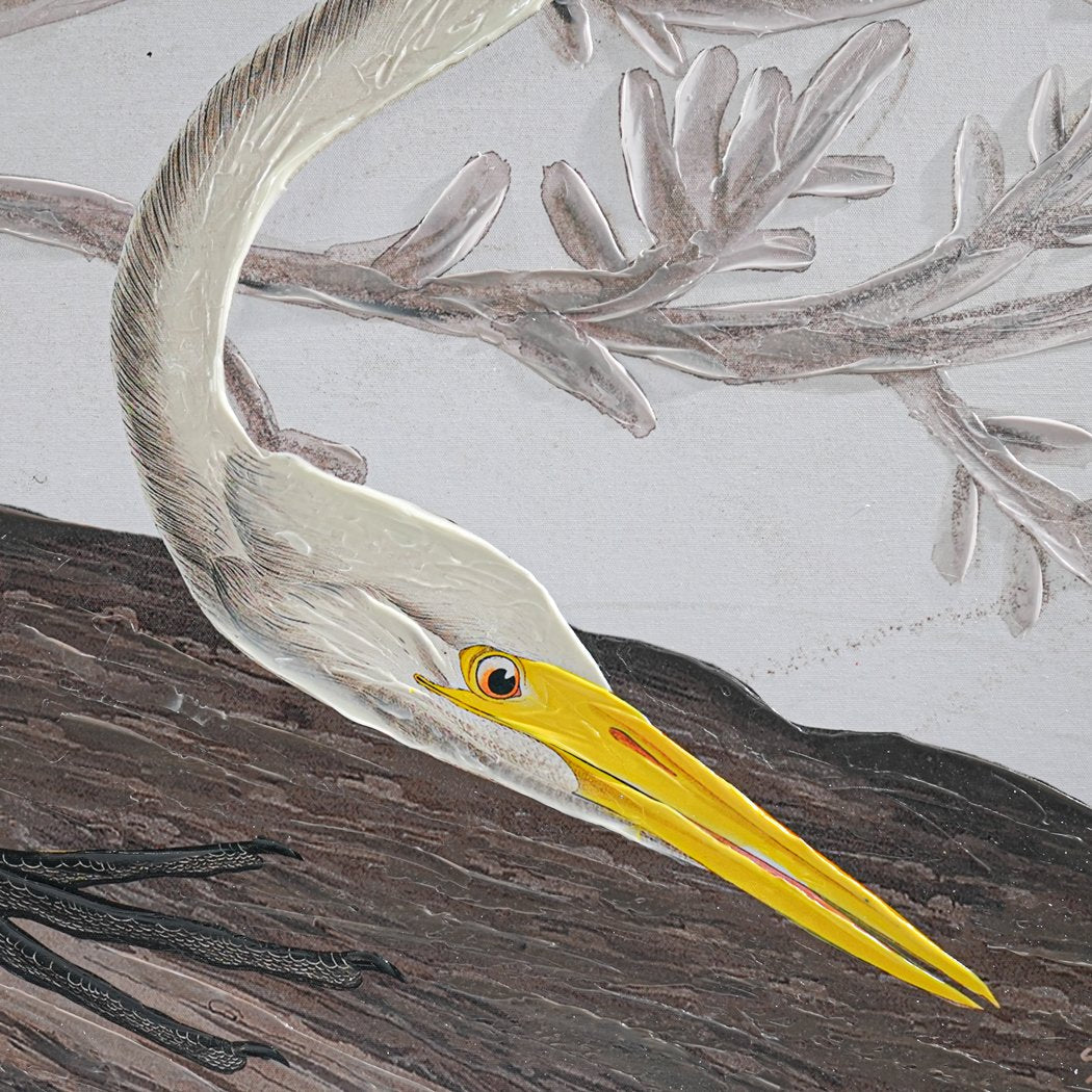 This exquisite artwork by Shay, an acclaimed American artist, captures the elegance of a heron against a serene botanical backdrop. Shay’s textured brushstrokes bring the heron to life, showcasing her mastery of precision and passion in her artistic journey from culinary creations to vibrant visual storytelling. The muted tones and intricate detailing of the feathers harmonise beautifully with the natural foliage, evoking the tranquillity of French Provence. Perfect for adding sophistication to any interior setting.