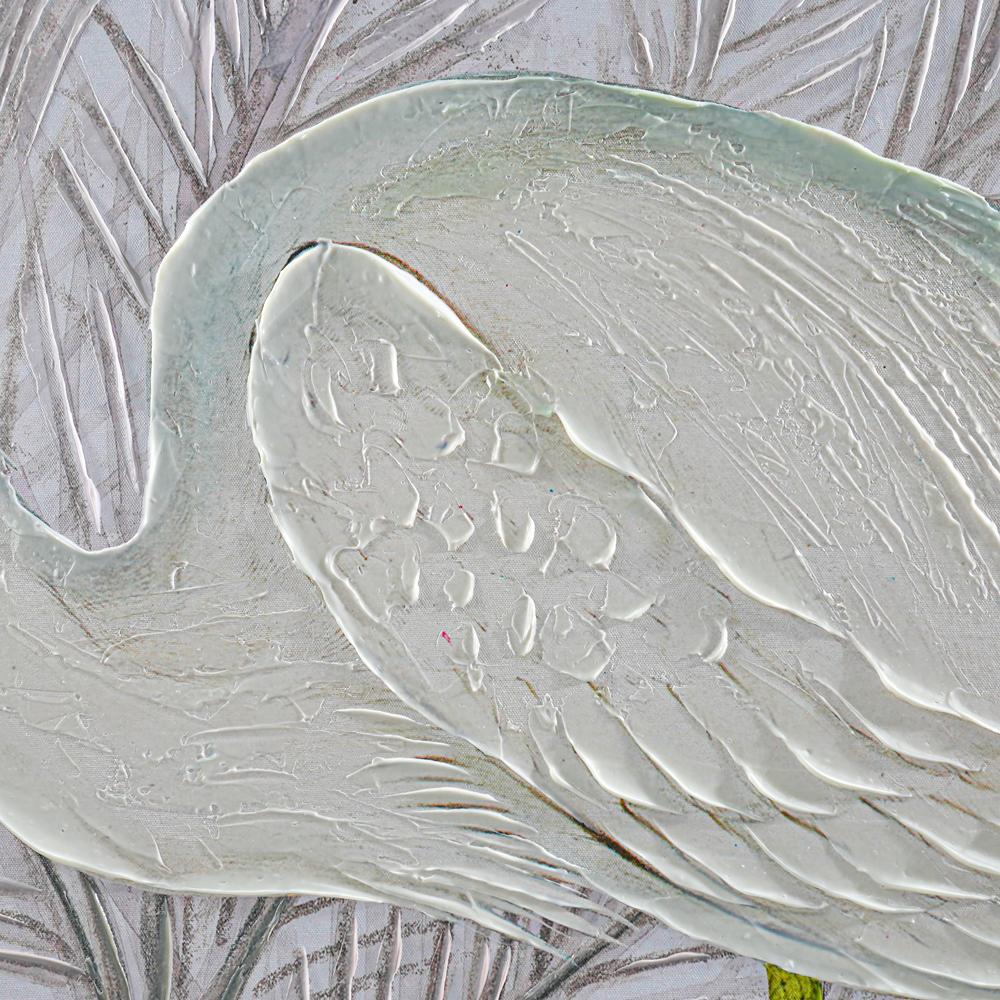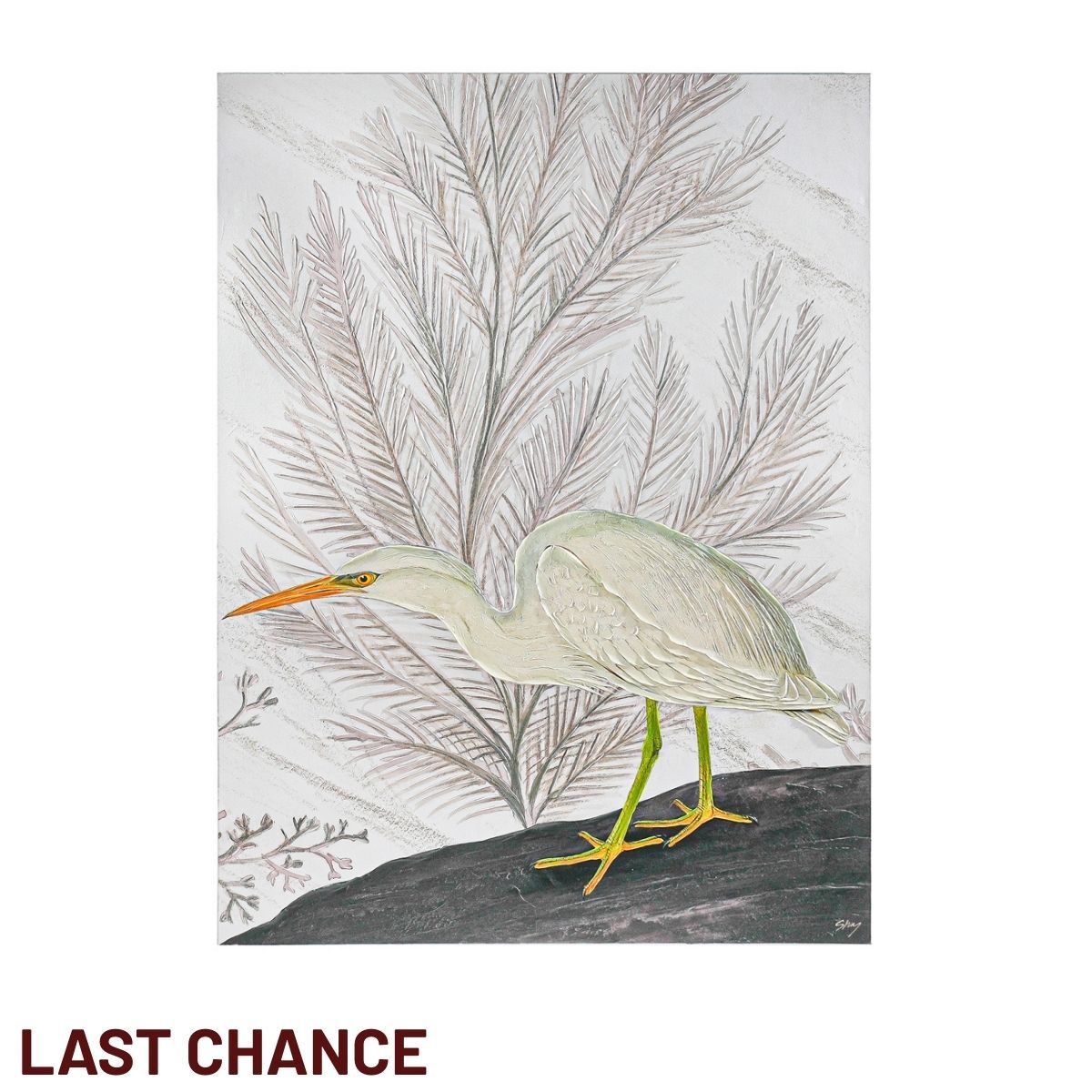 This exquisite artwork by Shay, an acclaimed American artist, captures the elegance of a heron against a serene botanical backdrop. Shay’s textured brushstrokes bring the heron to life, showcasing her mastery of precision and passion in her artistic journey from culinary creations to vibrant visual storytelling. The muted tones and intricate detailing of the feathers harmonise beautifully with the natural foliage, evoking the tranquillity of French Provence. Perfect for adding sophistication to any interior setting.